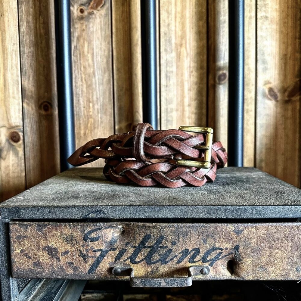 本作では、ブランドを象徴するオリジナルハンドシュリンクレザー RUSTED LEATHER(ラステットレザー) をメッシュ状に編み込み、バックルには無骨で存在感のある ブラス(真鍮)製ローラーバックル を採用。