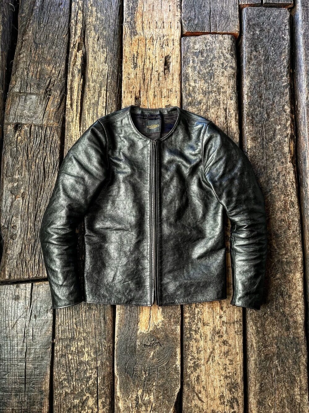 アンドコーラインで一番最初にリリースされた定番のノーカラージャケット 【バド】!!ベイツのレーシングスーツをぶった切ったスタイルは、斬新でスタイリッシュに感じます。 ベジタブルタンニン鞣し、ピグメントフィニッシュされた1.3㎜厚の上質なポーランド産ホースハイドを使用。 ALL BLACKです!! 着た時に驚くほどの軽さ、革馴染みを実感できます。 ノーカラーなので非常に合わせやすいFINE CREEK &COの素晴らしいモデルです。